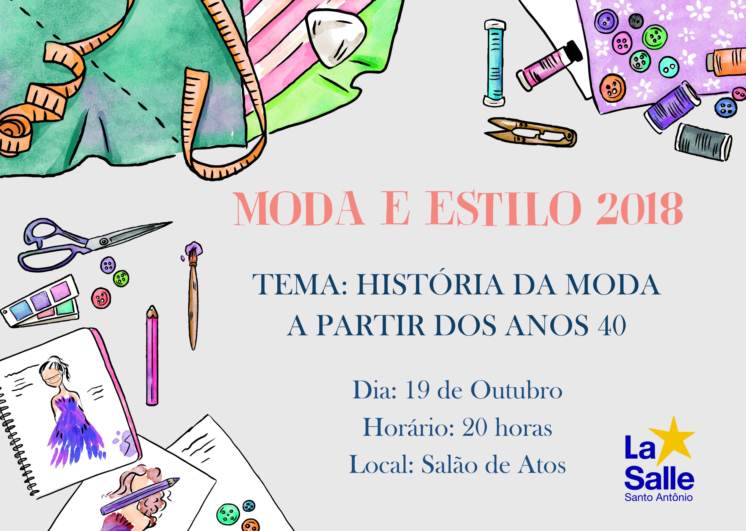 O Colégio La Salle Santo Antônio convida os pais e/ou responsáveis dos estudantes do 7º ano do Ensino Fundamental a prestigiá-los no evento do Projeto Moda e Estilo que ocorrerá na sexta-feira (19/10), às 20 horas, no Salão de Atos do Colégio. O Projeto Moda e Estilo deste ano terá como tema História da Moda a partir dos anos 40. Não perca!!