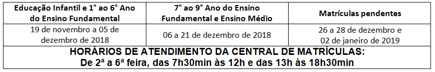 Informamos que não é possível oferecer garantia de vagas após 2/1/2019. Por isso, alertamos a todos os responsáveis sobre a importância de realizar a matrícula até a data limite, visto que muitas turmas estão com lotação total, e, caso sobrem vagas, estas serão disponibilizadas para alunos novos a partir do dia 03 de janeiro de 2019.