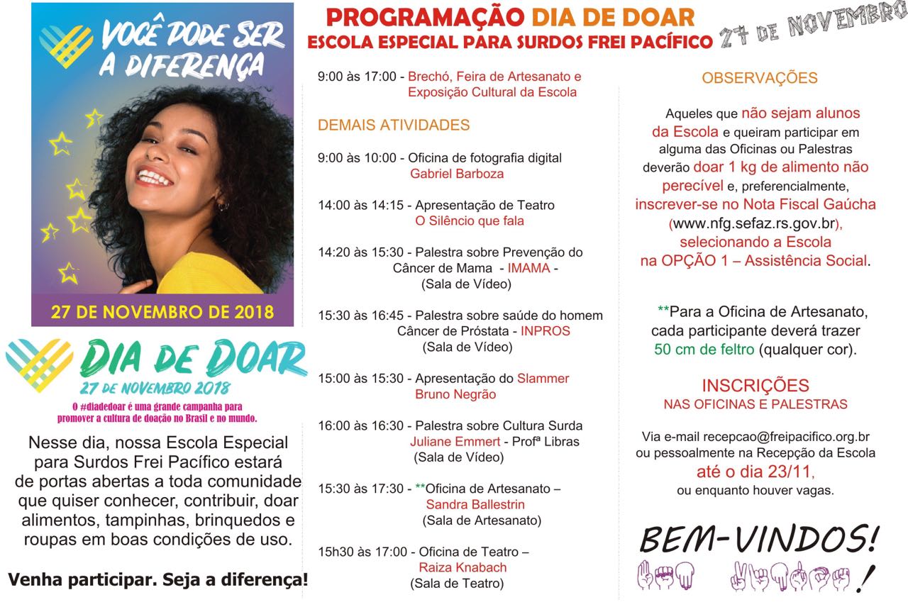 No dia 27/11, a Escola Especial para Surdos Frei Pacífico estará de Portas Abertas a toda a comuinidade que quiser conhecer, contribuir, doar alimentos, tampinhas, brinquedos e roupas em boas condições de uso. A instituição preparou um dia cheio de atividas com Feira de Artesanato de Natal, Brechó, Exposição Cultural, Oficinas, Palestras, Teatro e apresentação do Slammer Bruno Negrão.