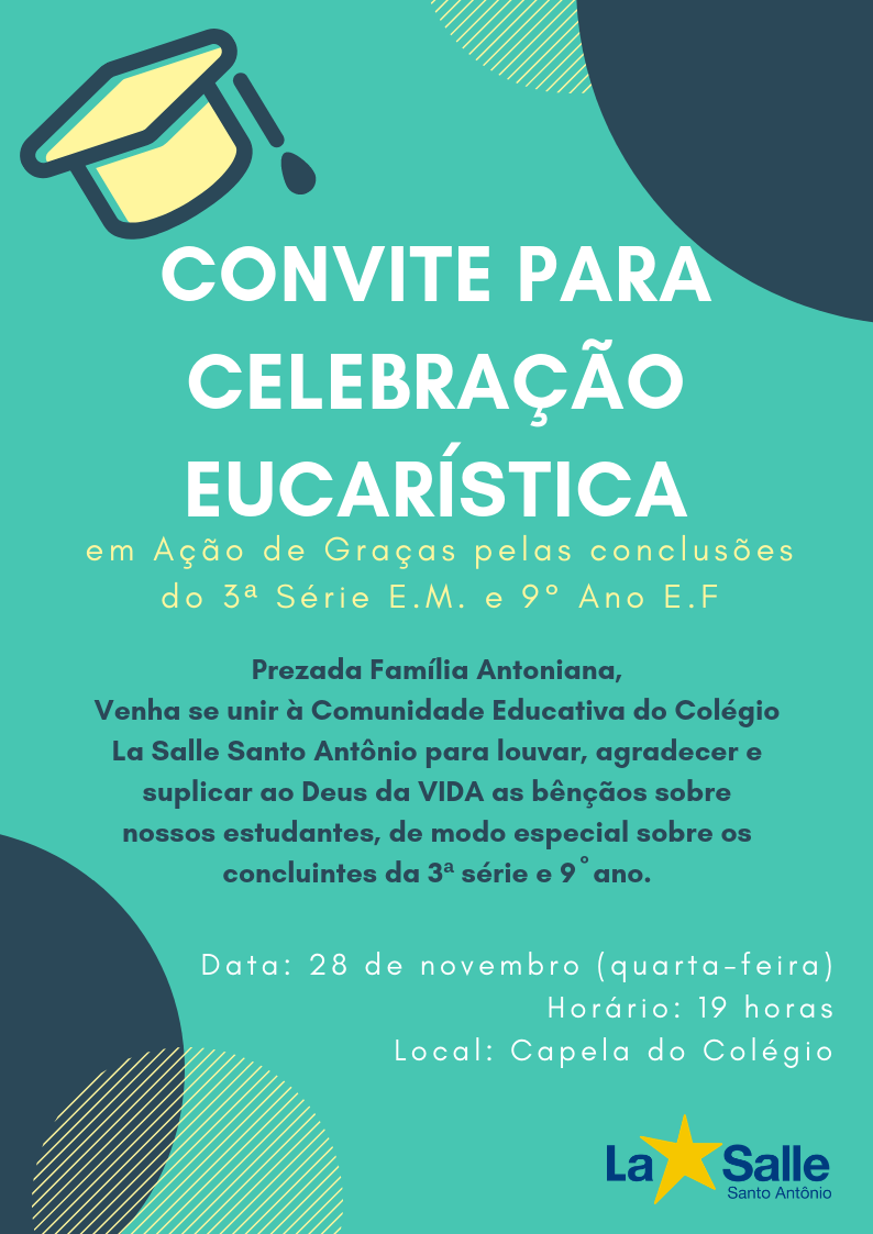 O Colégio La Salle Santo Antônio convida para a Celebração Eucarística em Ação de Graças pelas conclusões do 9º Ano do Ensino Fundamental e 3ª Série do Ensino Médio. A Missa acontecerá amanhã no dia 28 de novembro (quarta-feira), às 19 horas, na Capela do Colégio.