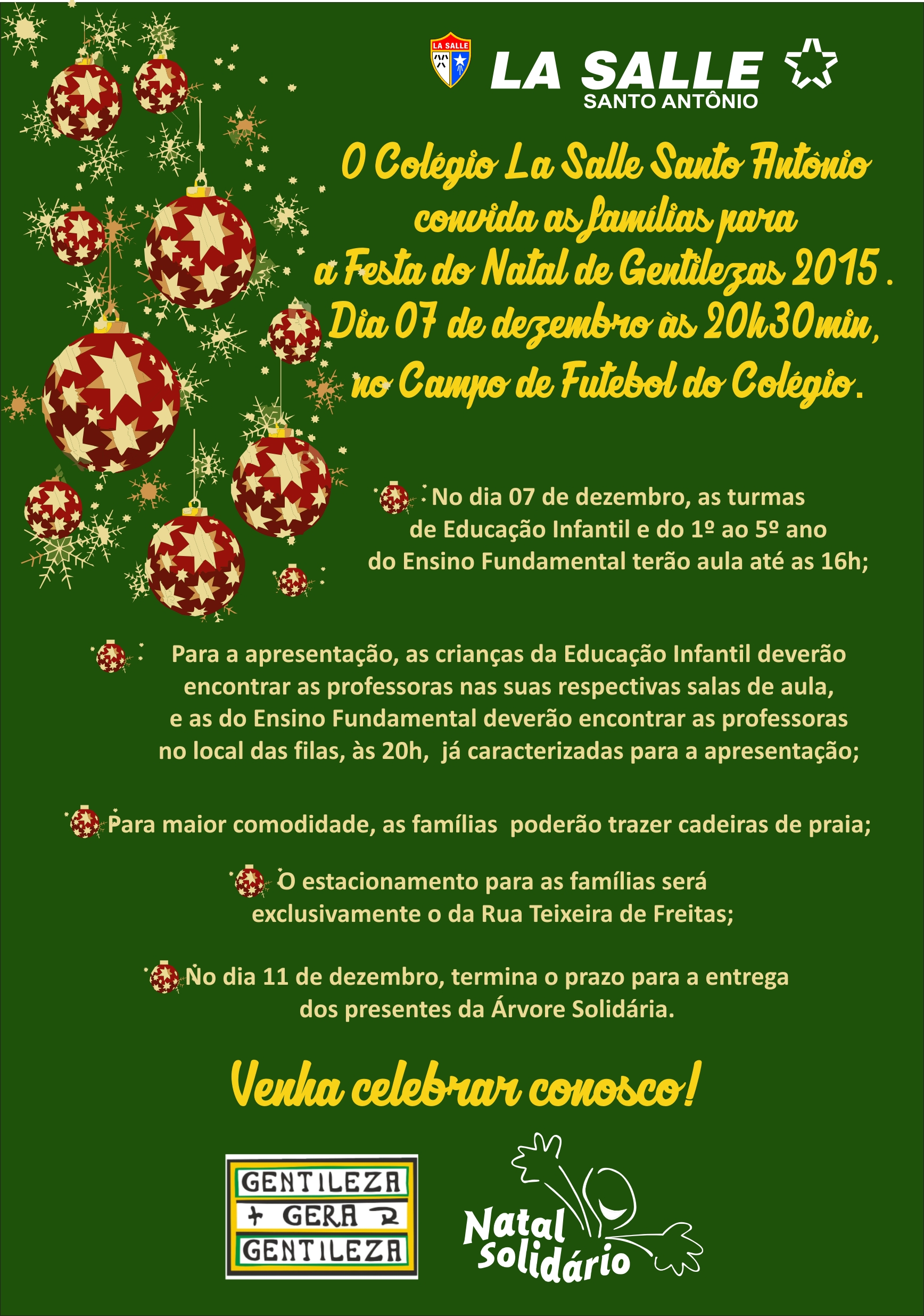 Infelizmente registramos novamente previsão de chuva para o dia 09 de dezembro, por esse motivo a Festa de Natal 2015 será antecipada para o dia 07 de dezembro (segunda-feira), permanecendo o mesmo horário, 20h30min. As orientações quanto ao horário de aula e organização das turmas continuam as mesmas.