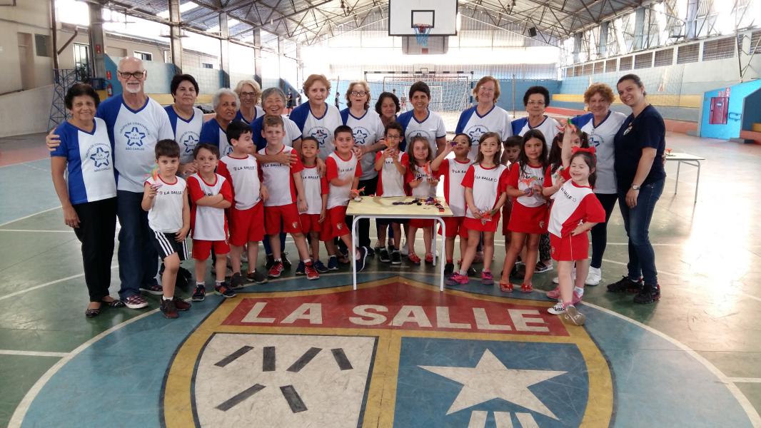 Na tarde da última terça-feira, dia 29 de agosto, ocorreu um encontro de gerações nas quadras esportivas do Colégio La Salle São Carlos, entre as integrantes do Grupo de Convivência Lassalista e duas turmas de alunos da Educação Infantil. As crianças brincaram com jogos de peteca e chincha, que foram confeccionadas pelas integrantes do Grupo da Terceira Idade.