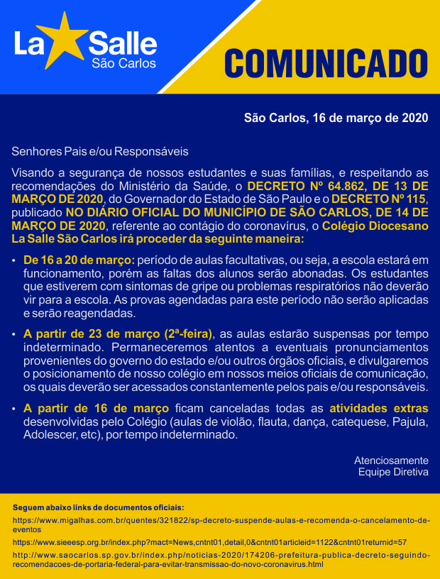 Visando a segurança de nossos estudantes e suas famílias, e respeitando as recomendações do Ministério da Saúde, o DECRETO Nº 64.862, DE 13 DE MARÇO DE 2020, do Governador do Estado de São Paulo e o DECRETO Nº 115, publicado NO DIÁRIO OFICIAL DO MUNICÍPIO DE SÃO CARLOS, DE 14 DE MARÇO DE 2020, referente ao contágio do Coronavírus, o Colégio Diocesano La Salle São Carlos irá proceder da seguinte maneira: