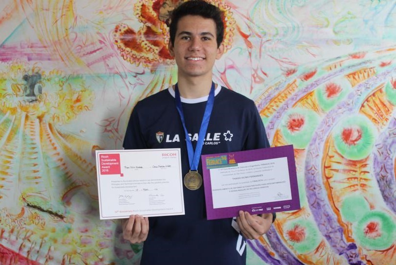 Participei da Feira Brasileira de Ciências e Engenharia – a FEBRACE –, a maior feira brasileira pré-universitária nesse segmento. Ganhei medalha de 3ª colocação (bronze) entre os quase 80 trabalhos apresentados na área de Engenharias pelo projeto Desenvolvimento de sistemas autossustentáveis para descontaminação e dessalinização de recursos hídricos. Meu trabalho foi desenvolvido junto com meu amigo Gabriel Bertho, também da 3ª série do EM, e sob orientação e coorientação de dois doutores, um da USP e outro da UFSCAR. Recebemos também o Certificado da Ricoh Sustainable Development Award 2016, pela inovação em sustentabilidade.