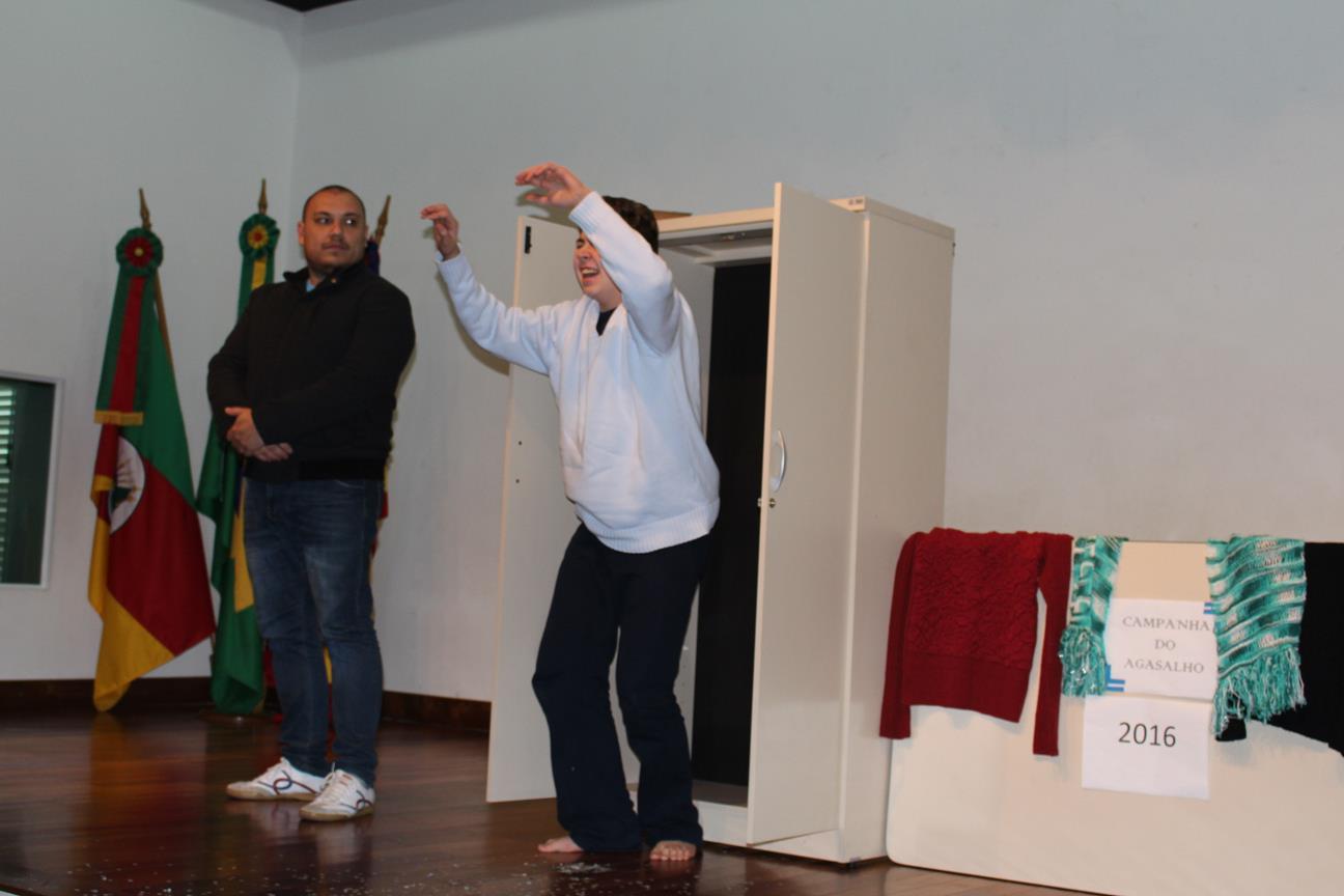 O mote da peça teatral, apresentado aos alunos na Semana do Estudante, propôs às crianças uma reflexão acerca do espírito solidário do aluno lassalista. O debate, adaptado à faixa etária, foi apresentado de forma lúdica mostrando peças de roupas que temos guardadas e que são esquecidas nos armários.