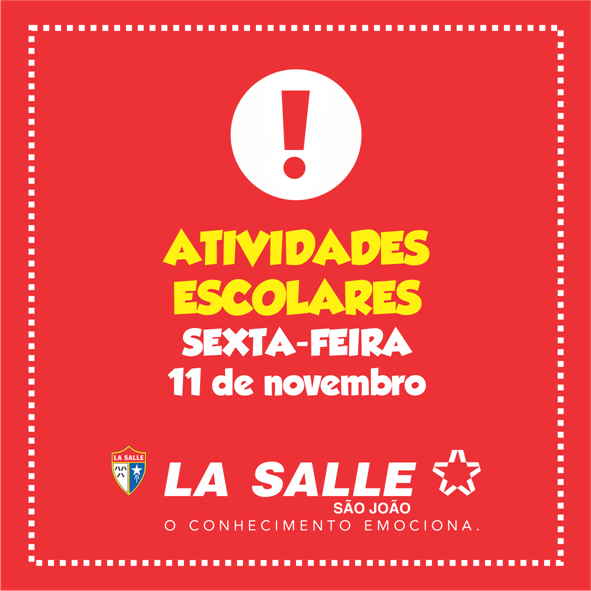 Em relação à paralisação anunciada para esta sexta-feira, 11 de novembro, o Colégio La Salle São João segue as orientações do SINEPE/RS e da Mantenedora da Rede La Salle e manterá as atividades letivas normalmente no respectivo dia.