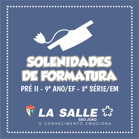 O Colégio La Salle São João convida os familiares dos alunos finalistas dos níveis de ensino - Pré II da Educação Infantil, 9º ano do Ensino Fundamental e 3ª série do Ensino Médio – para as Solenidades de Formatura que serão realizadas conforme o cronograma abaixo: