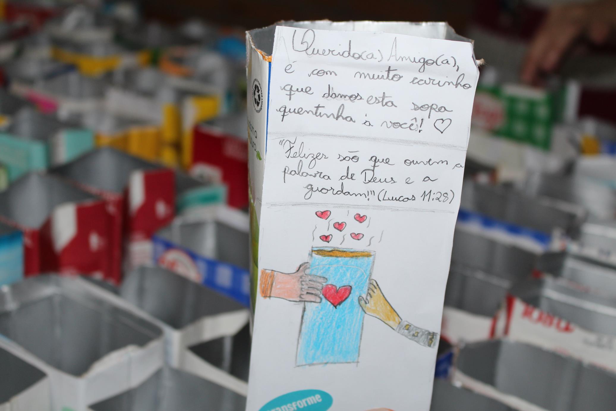Nessa segunda edição, as porções foram servidas em caixas de leite, doadas por familiares da Escola, e carinhosamente decoradas pelos alunos do 1º ao 5º ano/EF com palavras de incentivo e fé. As mensagens foram lidas e recebidas com muita alegria.