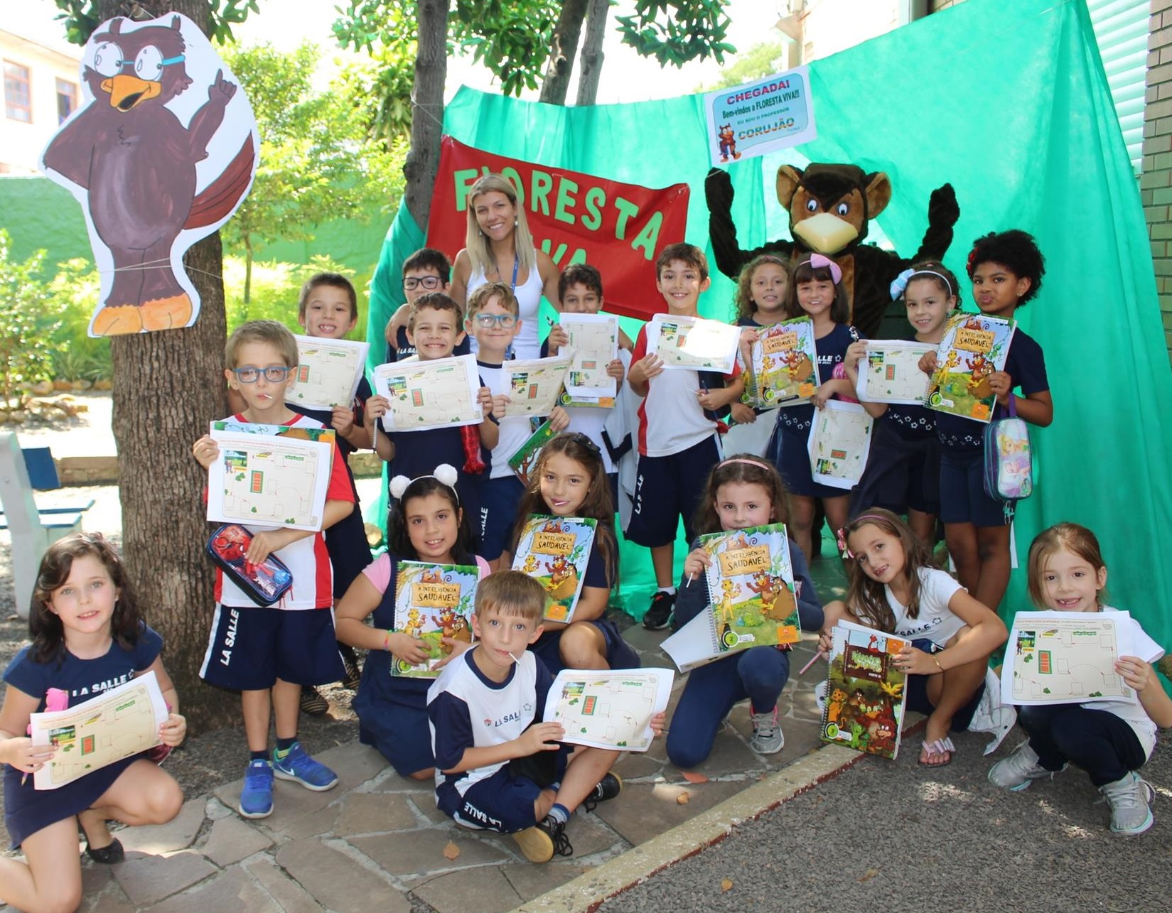 Ao chegar no final, na Floresta Viva, foram recepcionadas pelo próprio professor Corujão, que então mostrou aos alunos um baú onde estava o tesouro: os materiais didáticos que serão utilizados ao longo do ano.