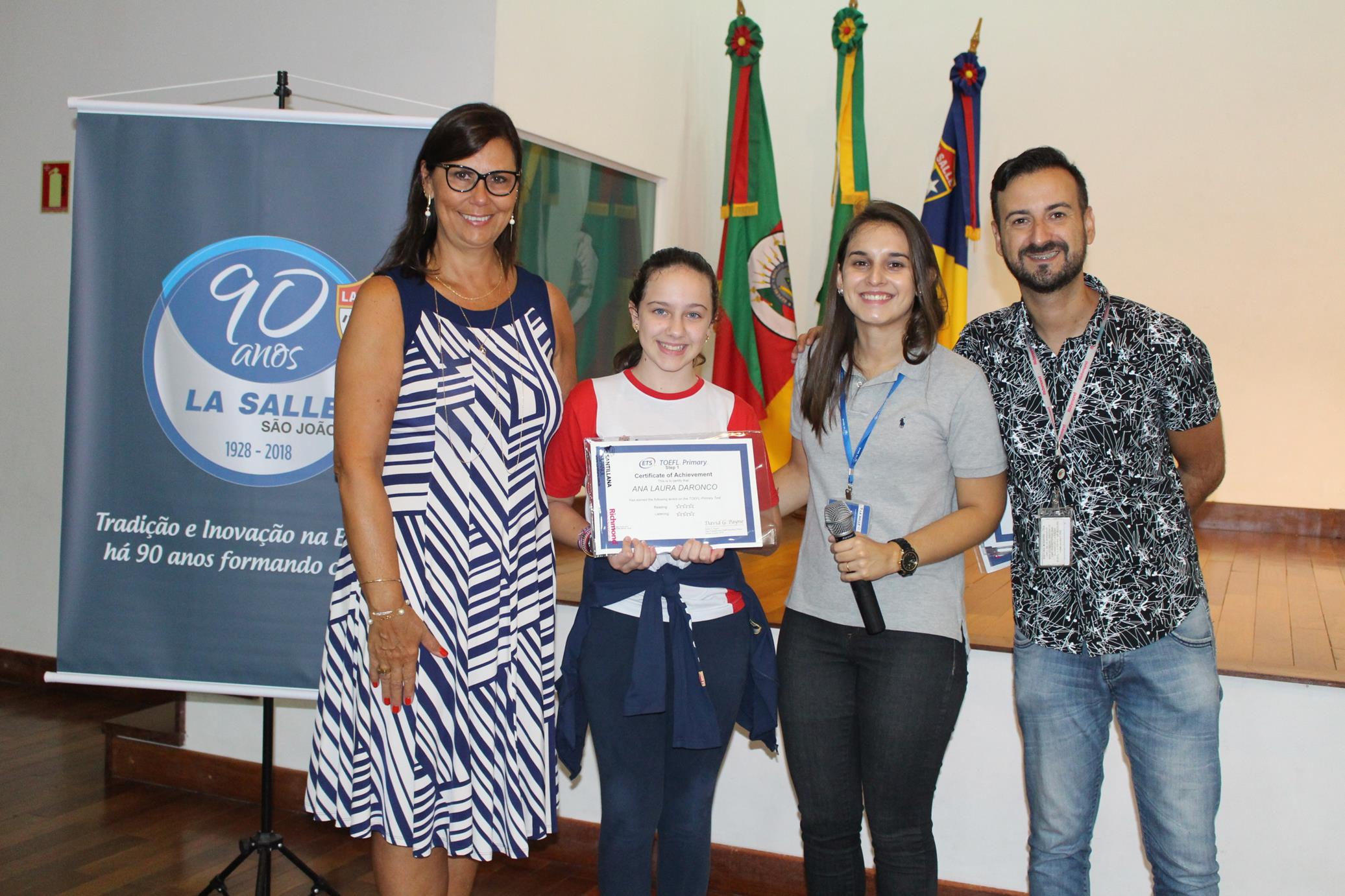 No dia 1 de março, dia em que comemoramos os 90 anos do Colégio, celebramos também um momento muito especial: a entrega da Certificação Toefl aos alunos que realizaram a formação e o teste no ano de 2017. A entrega foi feita pela diretora, Ana Poppe, pela professora de Língua Inglesa, Bruna Rocha, e pelo representante da Richmond, Mario Laranjo.