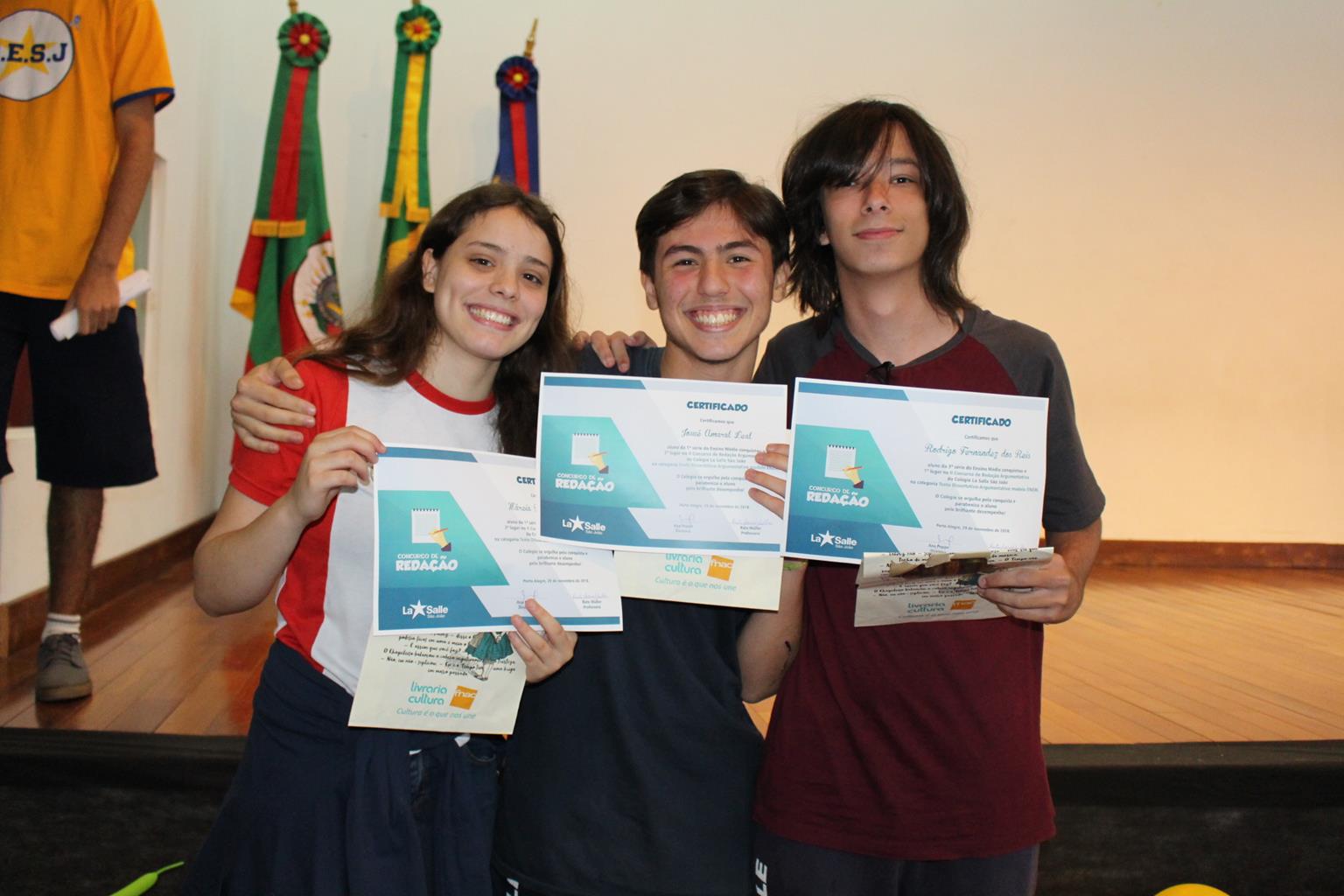No dia 29/11, durante o Show de Talentos promovido pelo Grêmio Estudantil – GESJ, foram conhecidos os vencedores do II Concurso de Redação Argumentativa do Colégio La Salle São João. Os alunos foram convidados a escrever sobre o tema “Como pensar diferente sobre poluição no século XXI” a partir de três textos de apoio.