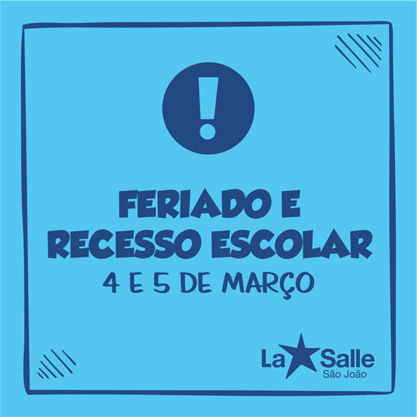 Conforme Calendário Escolar, lembramos que na próxima terça-feira, 5/3, é Feriado de Carnaval, e na segunda, 4/3, será realizado Recesso Escolar. Dessa forma, não haverá aula nos dois dias para toda a Comunidade Educativa (inclusive para o Turno Integral).