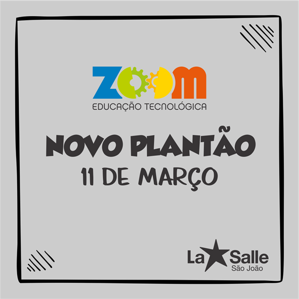 Na próxima segunda, 11 de março, a ZOOM Education realiza um novo Plantão na Escola. O Plantão acontece das 7h30 às 12h e das 13h às 17h, no saguão do bloco A. Além da venda, haverá a entrega dos estojos para aqueles que já efetuaram a compra e não retiraram.