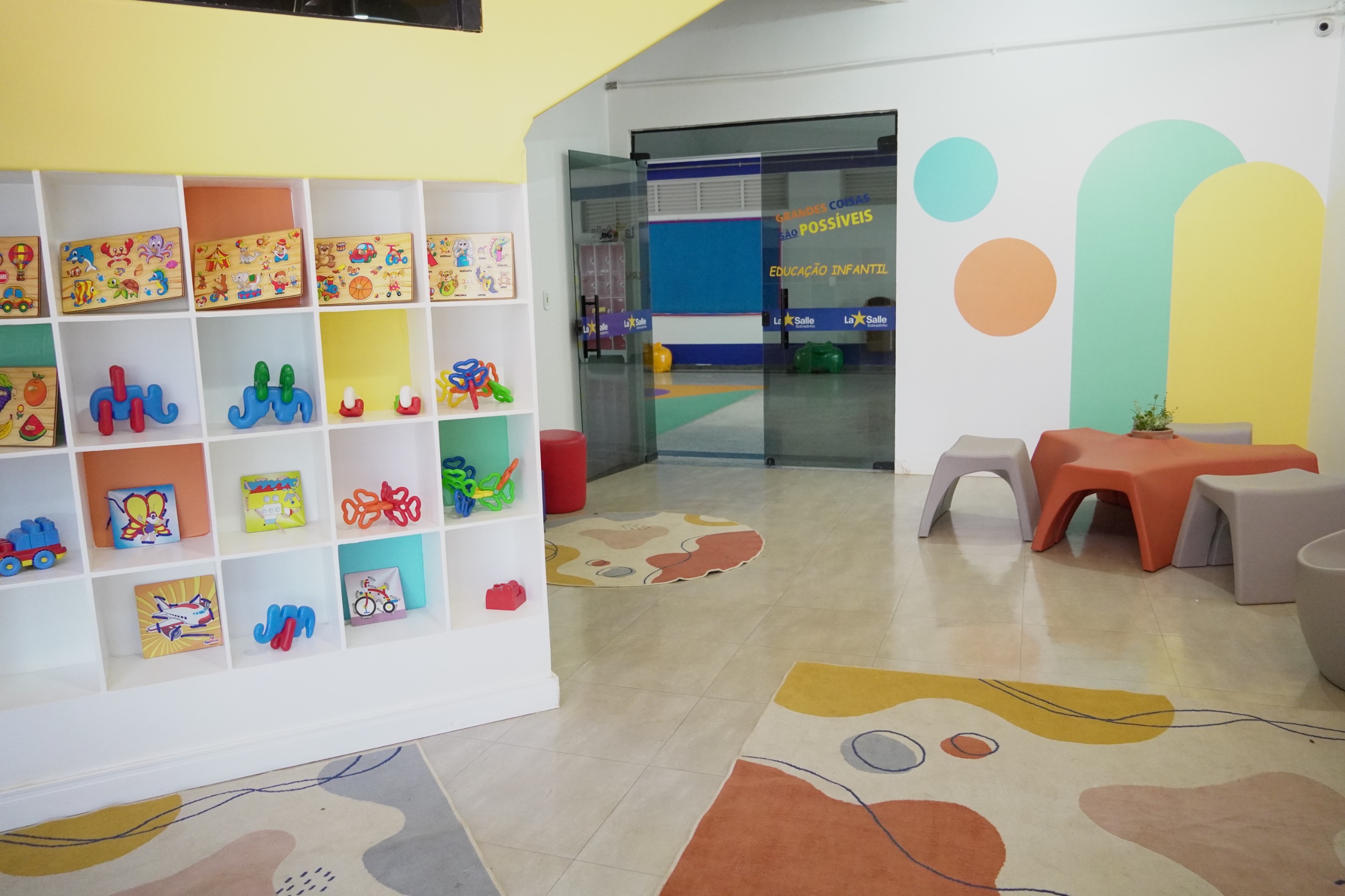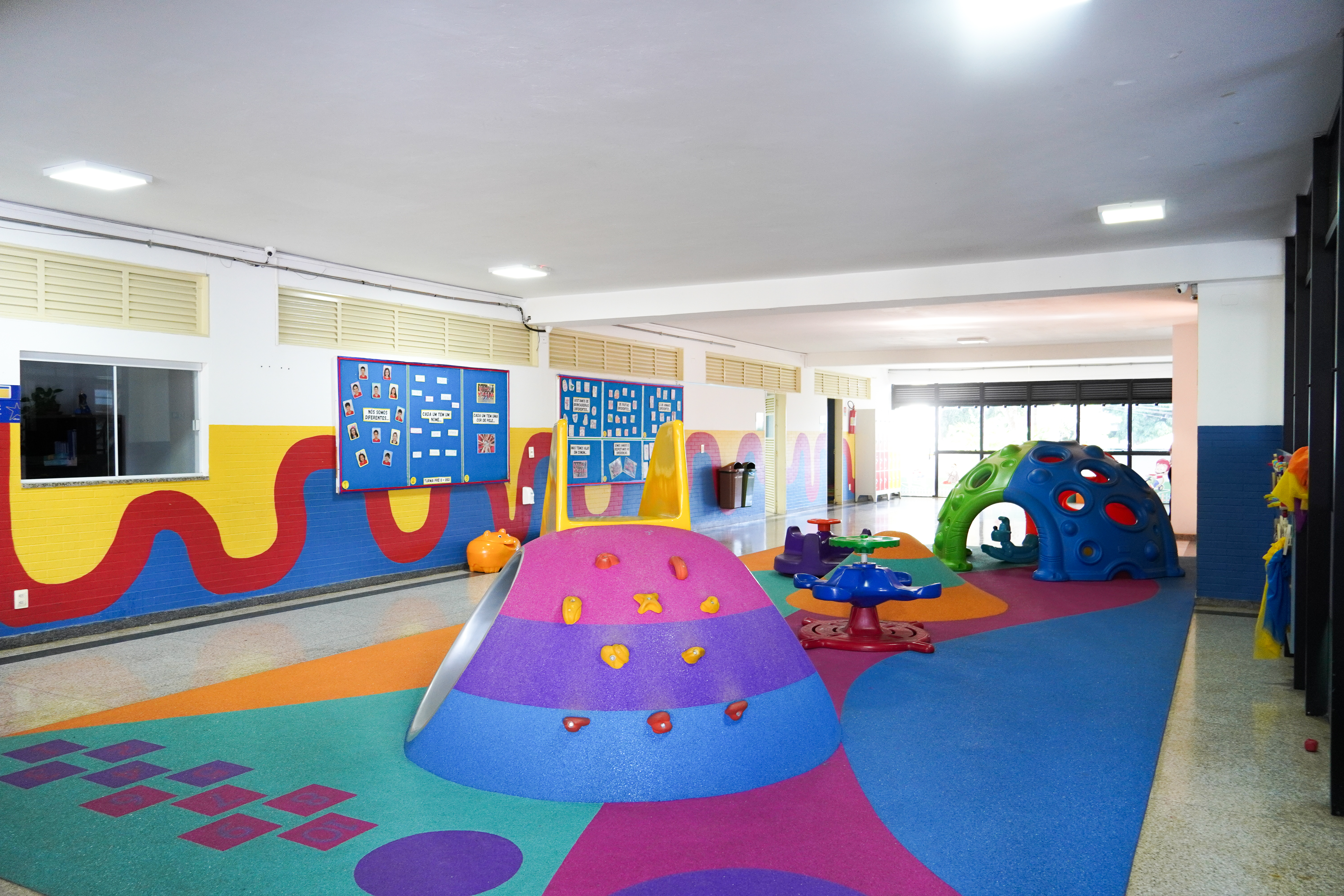 Parque coberto para as crinaças, com grama sintética, todo cercado para maior segurança.