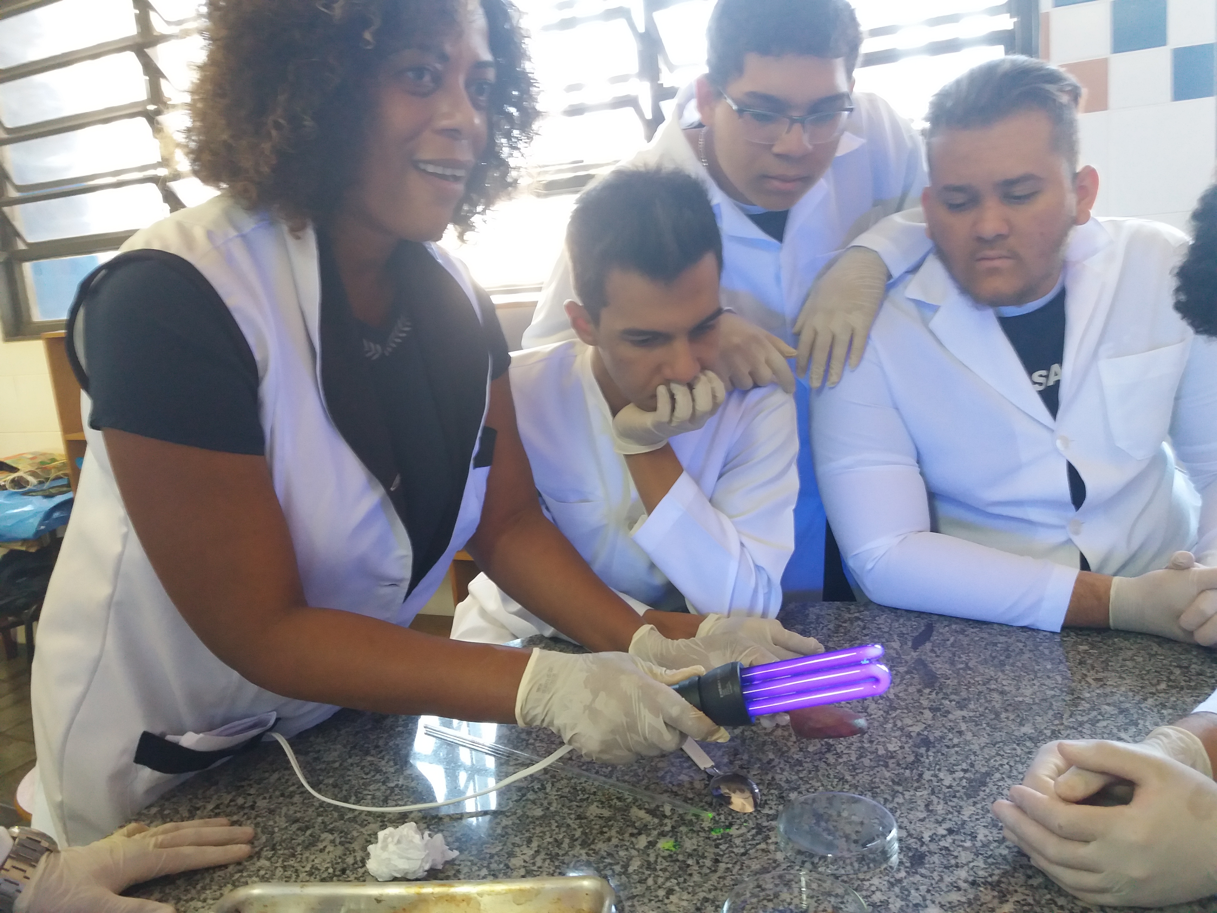 Estudantes do ensino médio do Colégio La Salle Sobradinho participaram de aulas de biologia forense no laboratório. Na primeira eles aprenderam como é feita a identificação impressões digitais das pessoas.